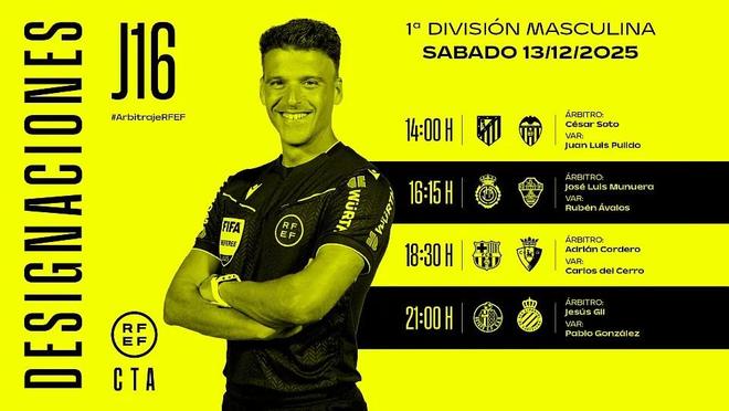 西班牙足协官方公布了周六西甲4场比赛的裁判安排,阿德里安-科尔德罗将执法巴萨vs奥萨苏纳。
